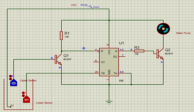 This mini-project focuses on the design and implementation of an Automatic Water Pump System. The primary objective is to create a system that can autonomously manage water levels in both an overhead tank and a reservoir, reducing the need for manual intervention. The system's key goals include automatically monitoring water levels in the overhead tank and reservoir, and subsequently activating the water pump as needed. This approach aims to conserve water resources by preventing unnecessary motor operation when the overhead tank is already full. The project also entails a comprehensive exploration of component selection, including gates, diodes, and transistors, to ensure optimal system performance. Logic gates are employed to compare water levels in the tank and reservoir, enabling the pump to activate when the tank's water level drops below a critical threshold, while ensuring that the reservoir maintains a pumpable water level. This innovative system promises to streamline water management, enhance efficiency, and contribute to water conservation efforts.